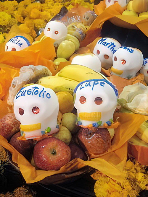 Con respecto a las calaveritas, las hay también de cartón o papel maché, además de chocolate, azúcar, amaranto y de las vitrinas de las panaderías asoman los panes de muerto con sus huesitos de harina esponjados; se ven ofrendas, altares, representaciones de la muerte que se alejan mucho de la imagen triste y macabra que toma en otras culturas.