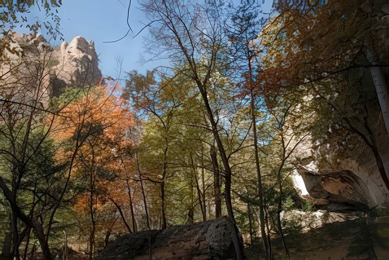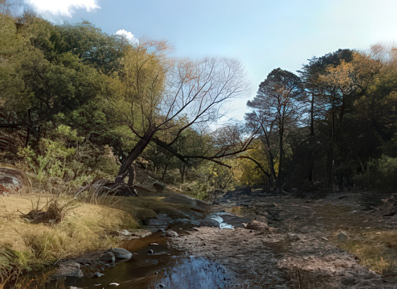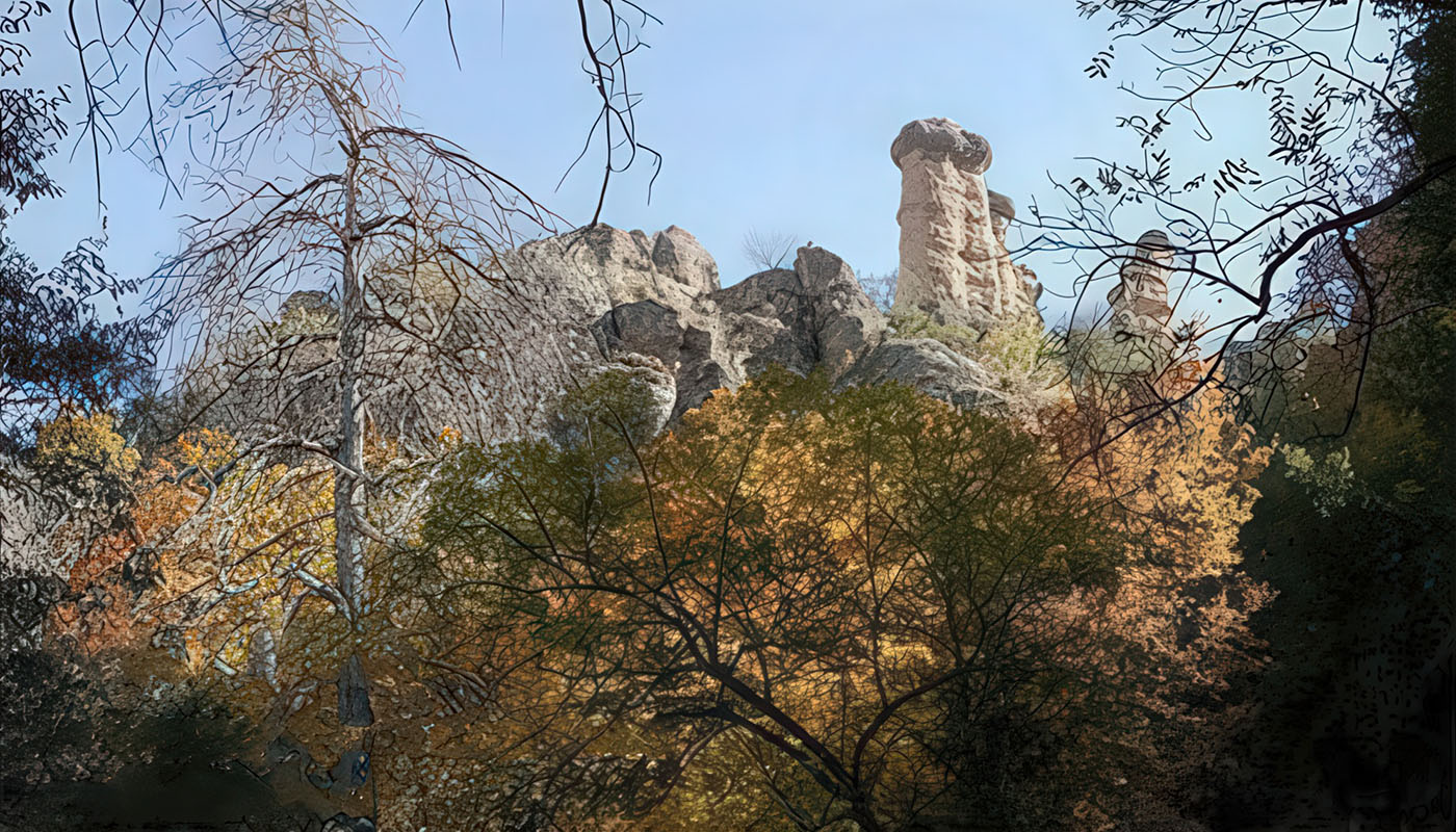 En los últimos días de otoño, las hojas de los Ailes o Maples, se han tornado totalmente rojas y amarillas, y sólo algunos árboles están libres de follaje o lucen brotes tiernos verdosos. En compañía del magnífico guía local, Saúl Torres, caminamos bordeando el arroyo La Chinaca, poco después de pasar la antigua misión de Sírupa. Atrás dejamos al río Papigochi, un curso de agua emblemático de esta región ubicada en el extremo oeste del estado. El trayecto es sinuoso y avanzamos en fila india cerca del agua, en algunos trechos pasamos sobre enormes rocas, en otros junto a pequeños acantilados, y a veces bajo inmensas paredes pétreas rojizas. El recorrido desde Madera, de 30 km. de terracería, lo hicimos en auto y después caminamos más de 2 horas para llegar hasta la Zona Arqueológica de Rancherías.